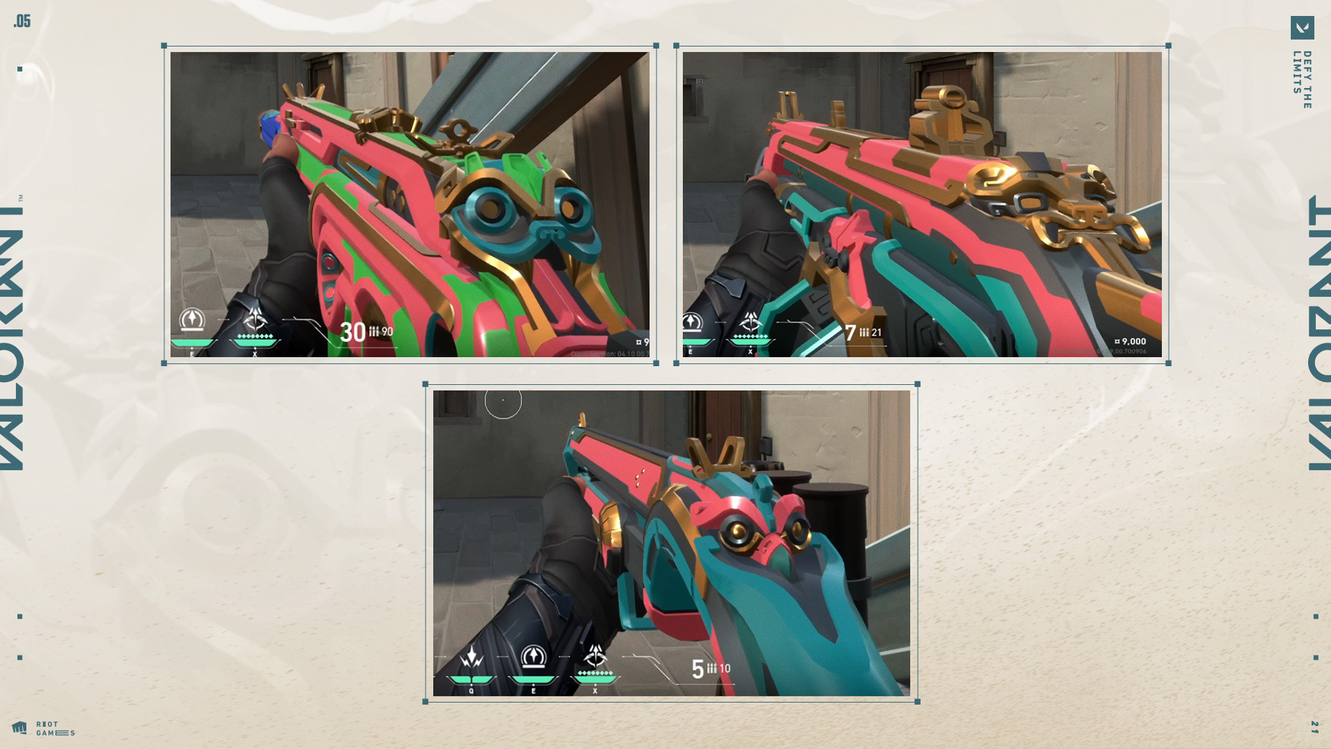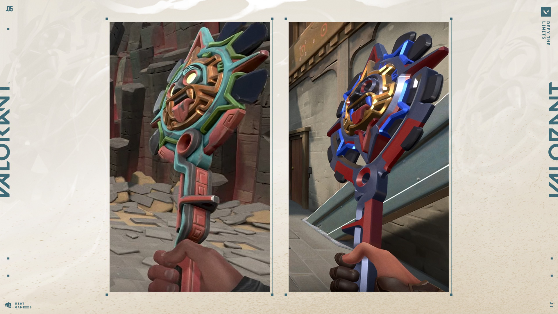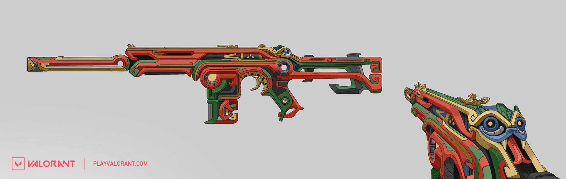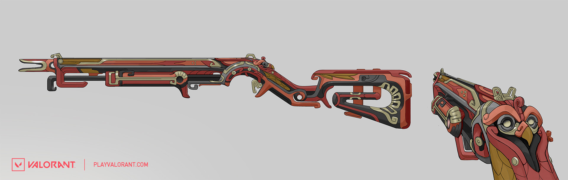 안녕하세요! 태양석 스킨 시리즈의 다른 무기들에 대해 말씀드릴 발로란트의 아트 아웃소싱 관리자 새미 페드래곤입니다 저는 고스트를 실체화한 라켈 님과 함께 일하면서 다른 무기들 또한 역사적인 정통성을 잘 반영하도록 유심히 지켜보았습니다.