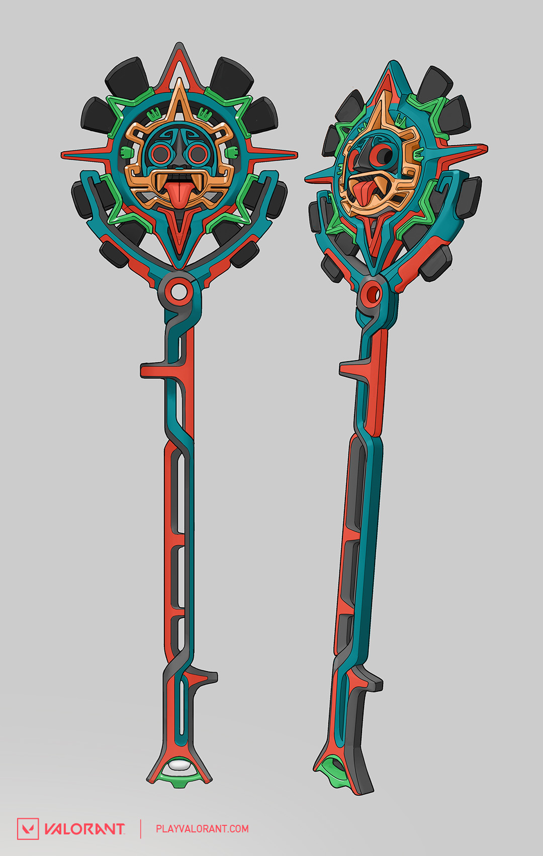 태양석 스킨을 현대에 맞게 표현할 때 컨셉을 3D 모델로 만들면서 최고로 멋지게 만드는 것이 가장 어려웠습니다. 무기의 초기 디자인에서는 특히 얼굴이 비뚤어져 있었고 작았으며 무기의 다른 요소에 비해 균형이 맞지 않았습니다. 아스텍 문명에서 볼 수 있는 아름다우면서도 섬세한 돌 공예와 같은 디자인으로 만들기 위해 무기의 여러 부분을 다시 작업하고 조정했습니다.