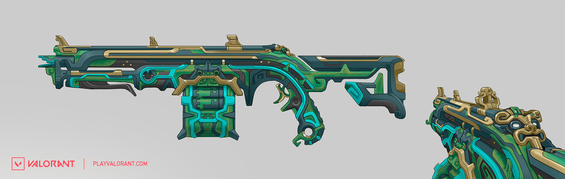 안녕하세요! 전 라이엇 게임즈 발로란트 프리미엄 콘텐츠 팀의 무기 아티스트인 라켈 가르시아라고 합니다. 이번에 태양석 스킨 시리즈 디자인 작업에 참여했으며, 그 디자인 과정에 관해 이야기하게 되어 매우 기쁩니다. 발로란트 아트 아웃소싱 관리자인 새미 페드래곤 님이 이어서 디자인에 관해 설명해주실 것입니다.